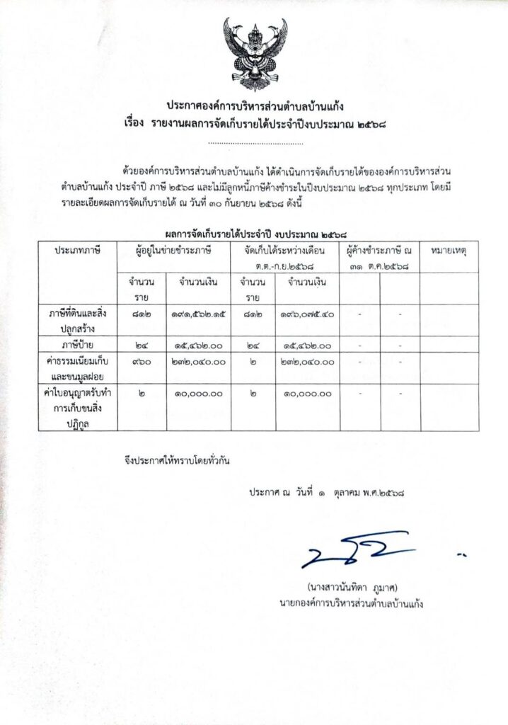 ประกาศเรื่องรายงานผลการจัดเก็บรายได้ ปีงบประมาณ 2568 - องค์การบริหารส่วนตําบลบ้านแก้ง อำเภอแก้งคร้อ จังหวัดชัยภูมิ