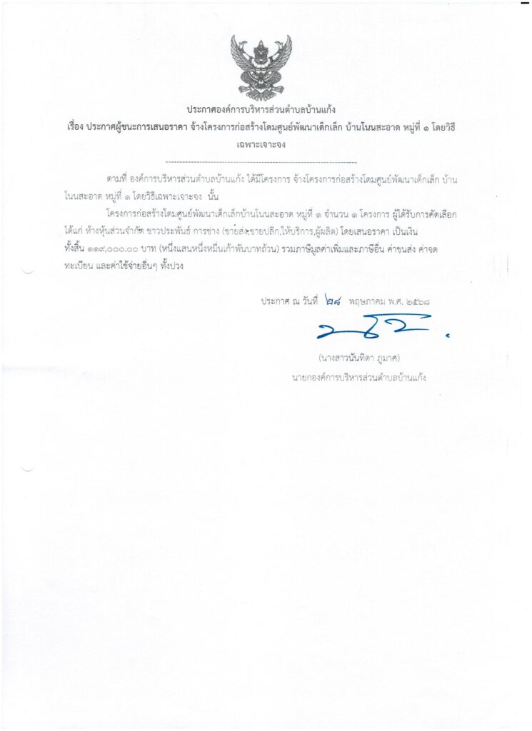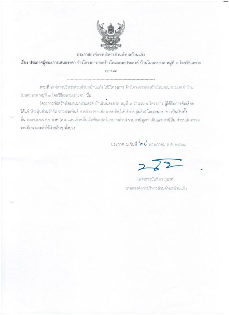 ผู้ชนะการเสนอราคาจ้างโครงการก่อสร้างโดมอเนกประสงค์ จำนวน 2 โครงการ - องค์การบริหารส่วนตําบลบ้านแก้ง อำเภอแก้งคร้อ จังหวัดชัยภูมิ