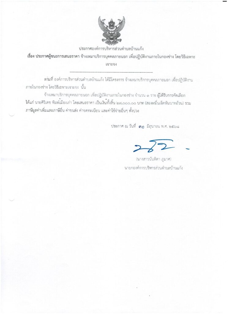 ผู้ชนะการเสนอราคาจ้างเหมาบริการบุคคลภายนอกเพื่อปฏิบัติงานภายในกองช่าง - องค์การบริหารส่วนตําบลบ้านแก้ง อำเภอแก้งคร้อ จังหวัดชัยภูมิ