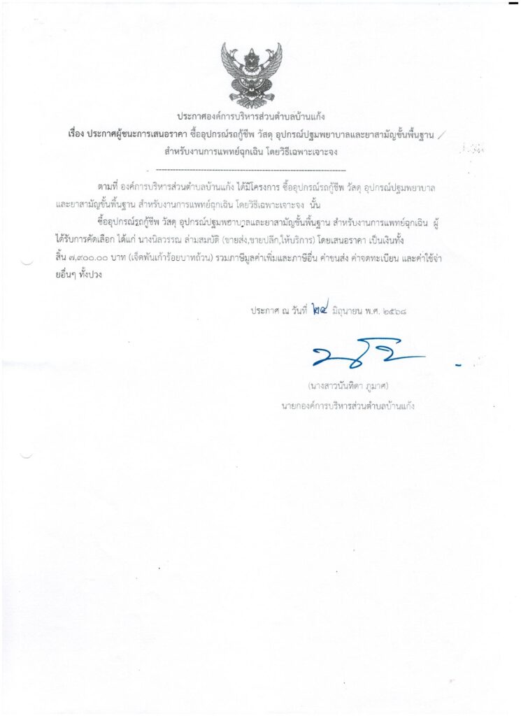 ผู้ชนะการเสนอราคาซื้ออุปกรณ์รถกู้ชีพ วัสดุอุปกรณ์ปฐมพยาบาลและยาสามัญขั้นพื้นฐานสำหรับงานการแพทย์ฉุกเฉิน - องค์การบริหารส่วนตําบลบ้านแก้ง อำเภอแก้งคร้อ จังหวัดชัยภูมิ